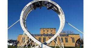 Nearly everyone in town was crowded around the fairgrounds grandstand on Saturday afternoon when Roger Dick, Jeremy Hughes and Cory Wimpfheimer rode vehicles through the giant metal loop.